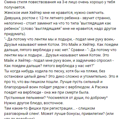 К примеру, когда я написала свой рассказ, отредактировала по тексту, потом по грамматике, потом отдала критику. Его отзыв: