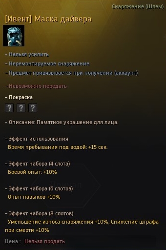 Все эти маски, теперь, лишь для скринчиков остались, а так это очередной умерший контент. Их теперь парой скафандров, из Подводного дворца, заменили. Один так и один через купон во внешку. Прикольно, на персе одновременно два скафандра надето. Надо, что бы переделанный во внешку на батискаф при перекрафте менялся, этакая коллаборация с Crimson Desert :)