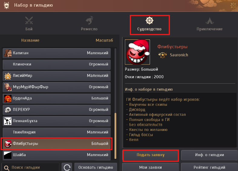 Все просто! Нужно лишь найти введя название нашей гильдии в разделе Судоходство,а также подать к нам заявку.