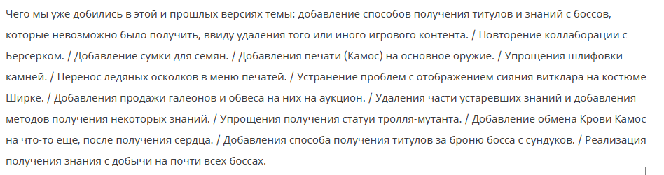 Чего мы уже добились в этой и прошлых версиях темы: добавление способов получения титулов и знаний с боссов, которые невозможно было получить, ввиду удаления того или иного игрового контента. / Повторение коллаборации с Берсерком. / Добавление сумки для семян. / Добавления печати (Камос) на основное оружие. / Упрощения шлифовки камней. / Перенос ледяных осколков в меню печатей. / Устранение проблем с отображением сияния витклара на костюме Ширке. / Добавления продажи галеонов и обвеса на них на аукцион. / Удаления части устаревших знаний и добавления методов получения некоторых знаний. / Упрощения получения статуи тролля-мутанта. / Добавление обмена Крови Камос на что-то ещё, после получения сердца. / Добавления способа получения титулов за броню босса с сундуков.