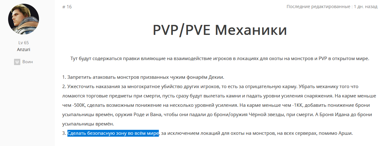 Про безопасную зону, понимаю что мера радикальная, но это поможет устранить нападки на коневодов и рыбаков, а также помешает засадам килек на дорогах. А игроки всё также смогут сражаться на локациях для охоты на монстров, чтобы решить какие-то разногласия. А на Арше вовсе останется полная свобода действий. Эта мера помешает по сути только килькам и подобным им игрокам, поэтому считаю что данная мера оправдана.