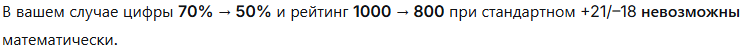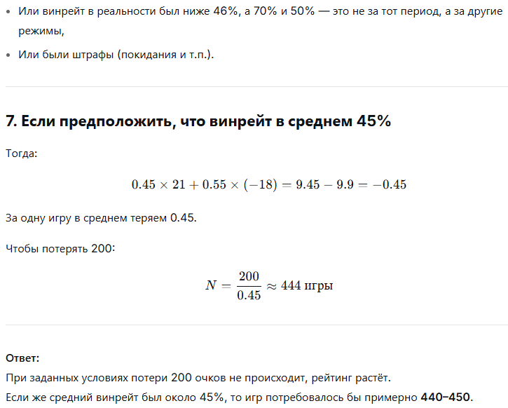 Надеюсь, объяснять, что цифра в 45% - это твой ВР на отрезке от 1000 птс до 800 птс не нужно? В любом случае, даже дипсик недвусмысленно намекает, что или ты самая быстрая рука на диком западе, нарегав 450 игр или обыкновенный криворукий п****бол, и я думаю, что второй вариант будет намного ближе.