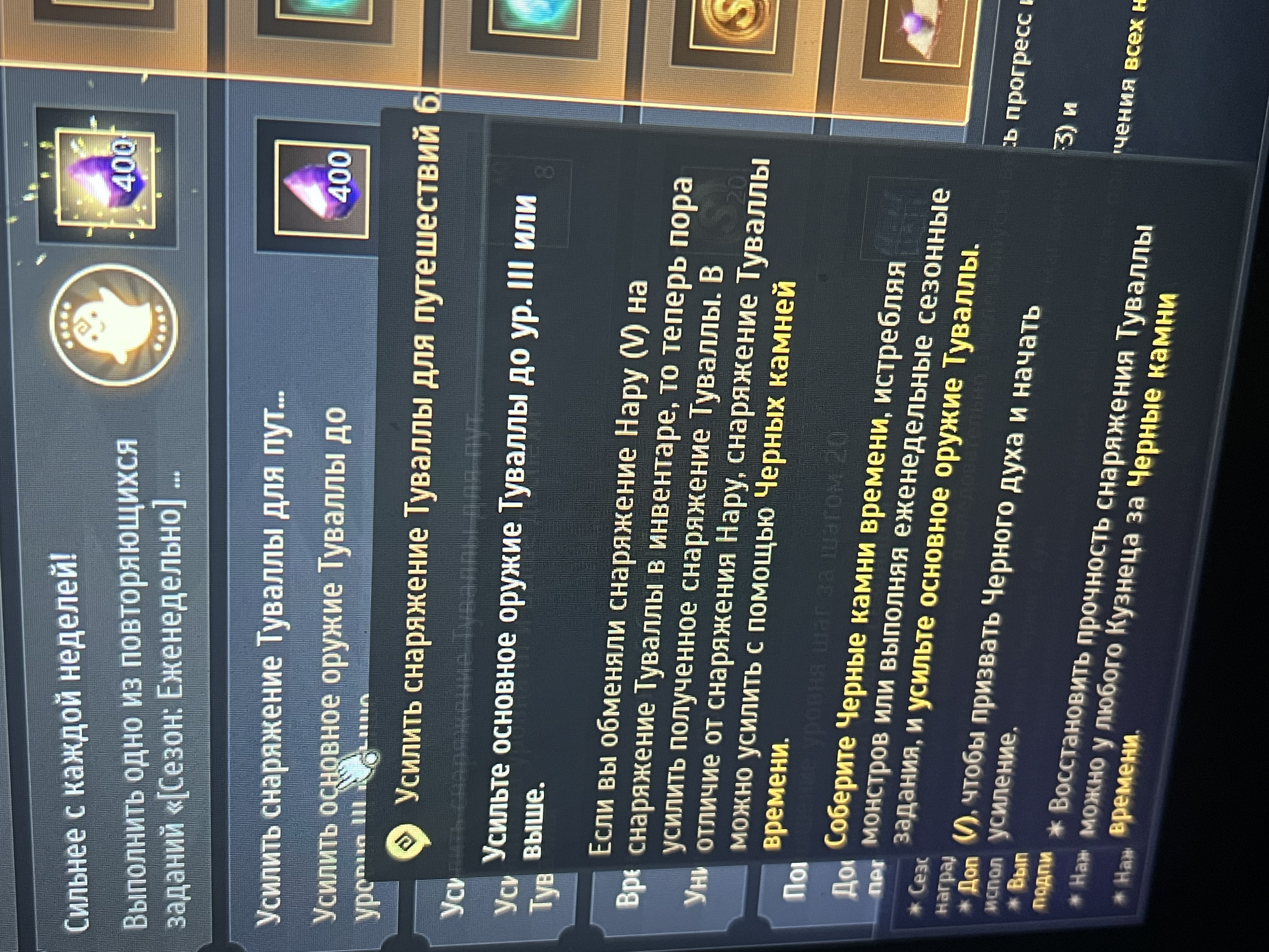 Здравствуйте. Прокачала все оружие туваллы до 4-5 уровня, но задание сезонного персонажа "Усилить снаряжение Туваллы для путешествий 6" почему-то не выполняется ... у кого такое было? Может я что-то пропустила?