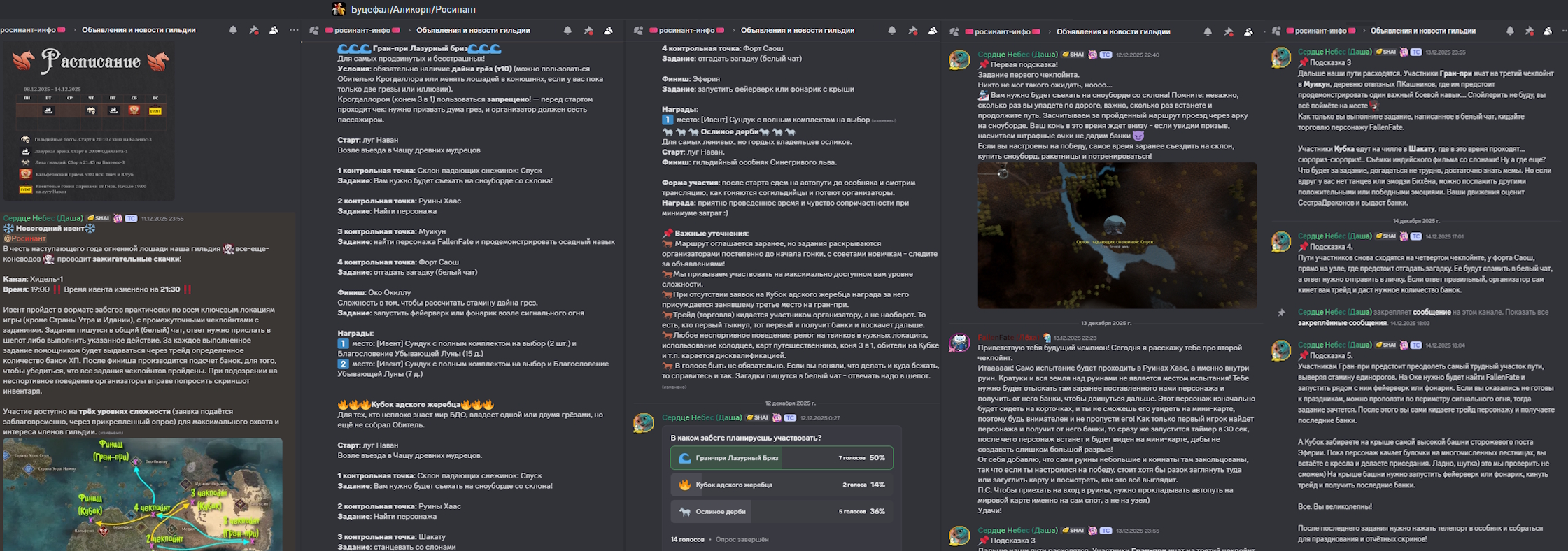 На этапе подготовки ивента мы опасались, что у вырвавшихся вперёд будет большее преимущество, чем у тех, кто чуть отстал. Но на разных отрезках пути лидеры менялись! Кто-то оказался более скилловым в управлении сноубордом, кто-то быстрее всех нашел спрятанного персонажа, а кто-то потерял преимущество, застряв на загадке. Самым волнительным был последний участок Гран-при: от форта Саош до Ока Окиллу. Лидер гонки выбрал не оптимальный маршрут, утопил единорога и добирался вплавь! Его соперники восстанавливали стамину на разных островах, а потом сократили дистанцию и прорвались к финишу! В это время на маршруте Кубка двое вылетевших из игры сражались за второе место, по очереди наступая друг другу на лица, пока карабкались по бесконечным лестницам на башню в Эферии.