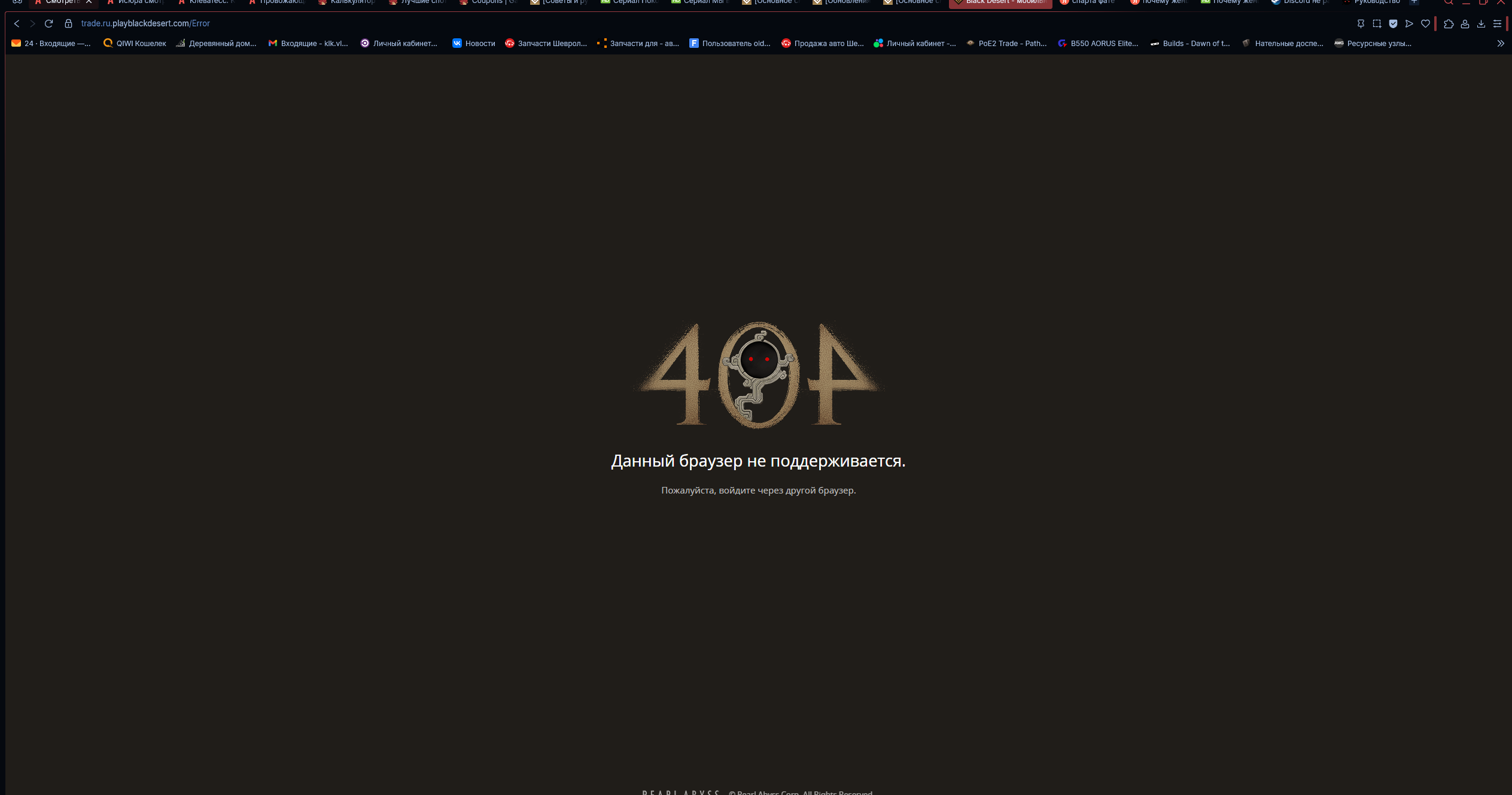 Веб версия аука доступна из меню Интересное, или же по ссылке https://trade.ru.playblackdesert.com . Если не открывается, то добавьте её куда-нибудь, чтобы открывалась, в исключения или же наоборот, и проверьте ещё раз. Вторые сутки аук работает после этого.