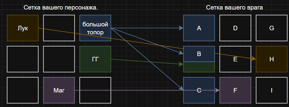 Предположим, основным героем является мечник, который может атаковать только одну цель, находящуюся в передней линии (отмеченную зелёным цветом). Наемник с огромным топором (обозначенный синим) способен поразить сразу трех противников в одной линии или нанести удар по соседним целям («А» и «B»). Лучник-наемник (помечен жёлтым) выбирает произвольную цель вне зависимости от её положения («Н»), а маг-наемник (фиолетовый) действует по любым объектам, расположенным в первой или второй линиях («A», «B», «C», «D», «E», «F»).