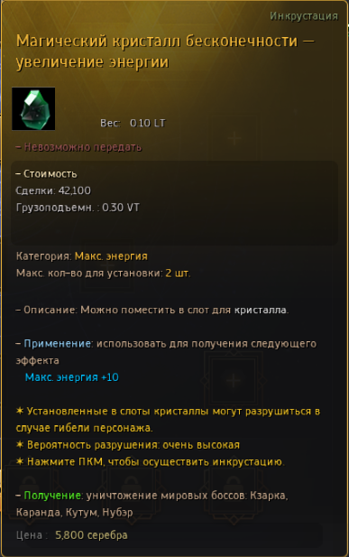 Даёт 10 энергии к Вашей максимальной энергии персонажа |