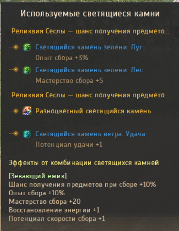 | Пресет светящихся камней в реликвиях: Зевающий ежик | 1 энергия | Открытие [Очищенных] Светящийся каменей, покупка с Аукциона. Обработка ненужных реликвий Сеслы, Кехелль, Ресии, Марши дает [Очищенный] Светящийся камень. | ![]() |