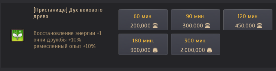 | [Пристанище] Дух векового древа | 1 энергия | Покупка в Пристанищах у НПСи Шерезара, покупка в Палатке. |