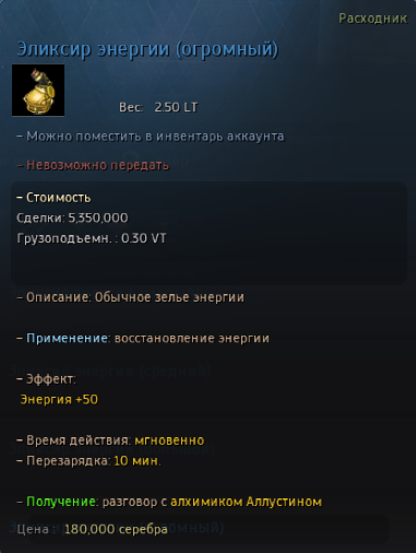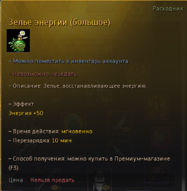 | Зелье энергии (большой) | 50 энергии |