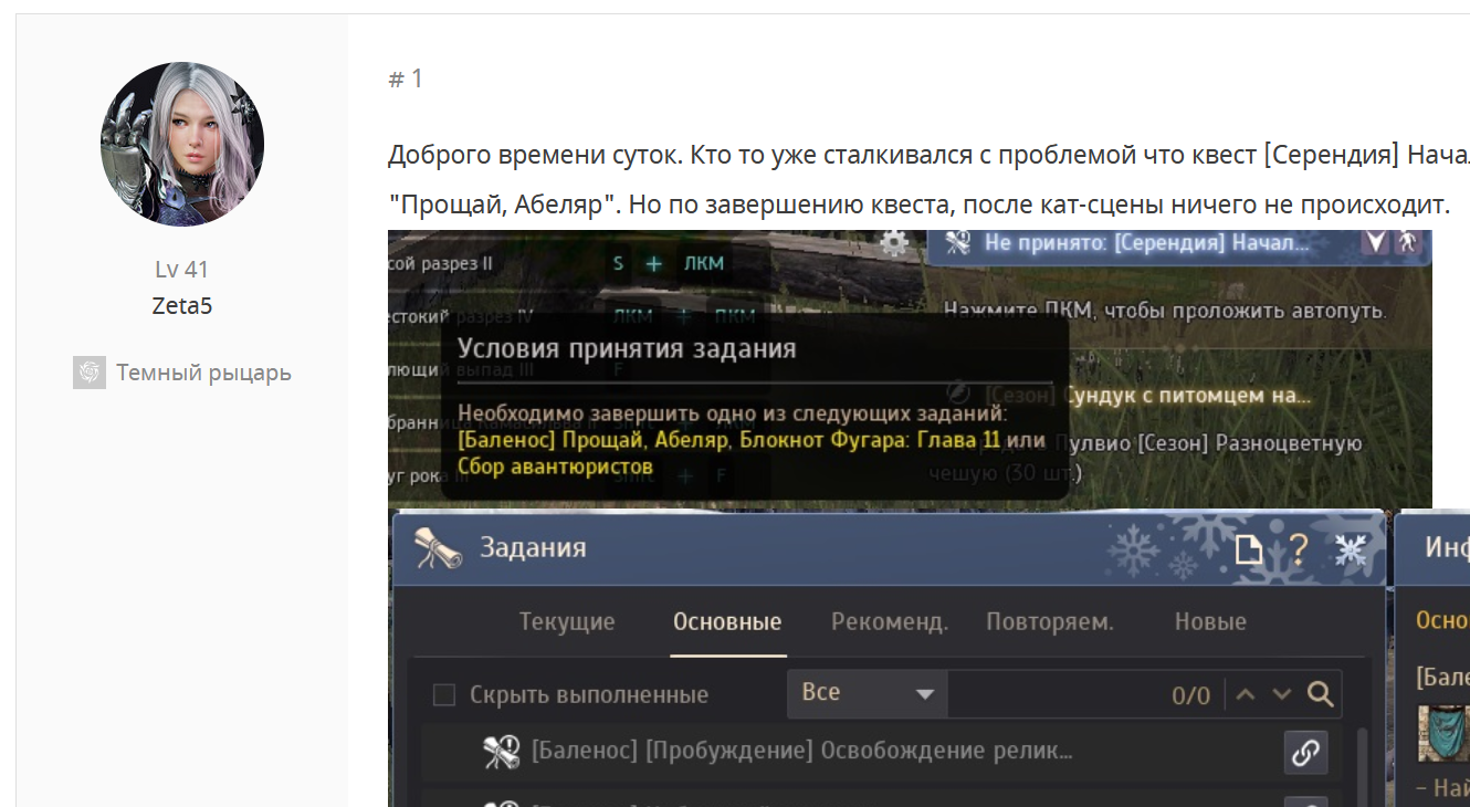 Доброго времени суток. Кто то уже сталкивался с проблемой что квест [Серендия] Начало не берется? Квест требует завршение квеста "Прощай, Абеляр". Но по завершению квеста, после кат-сцены ничего не происходит.