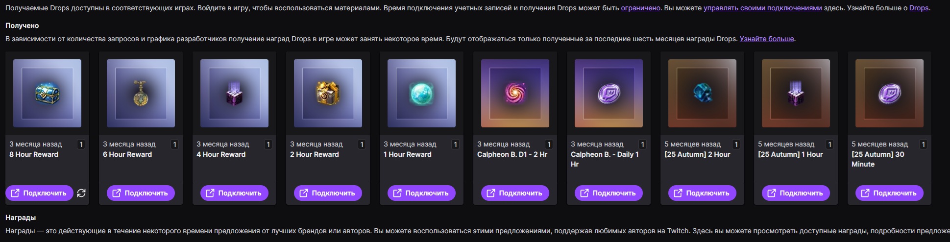 Если вы все делаете правильно то возможно на Twitch у вас получены Twitch Drops не с RU региона. Или эти награды уже получены , так как на скрине видно что уже прошло 1-3 месяца. Так как на скрине видно что они находятся в разделе "Получено" .