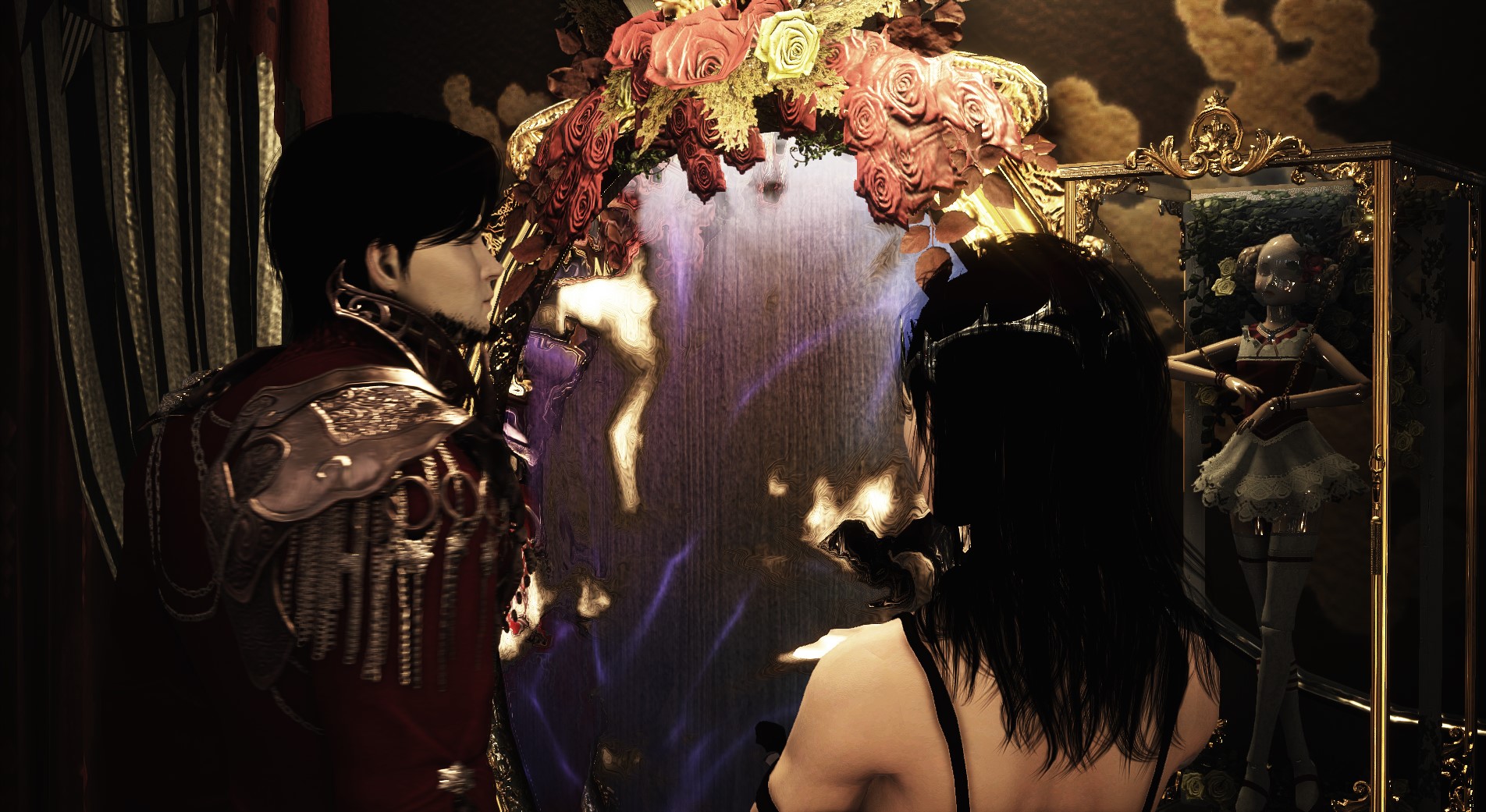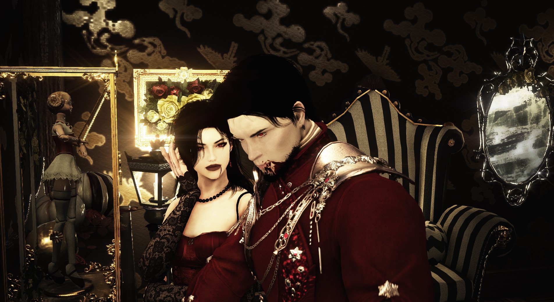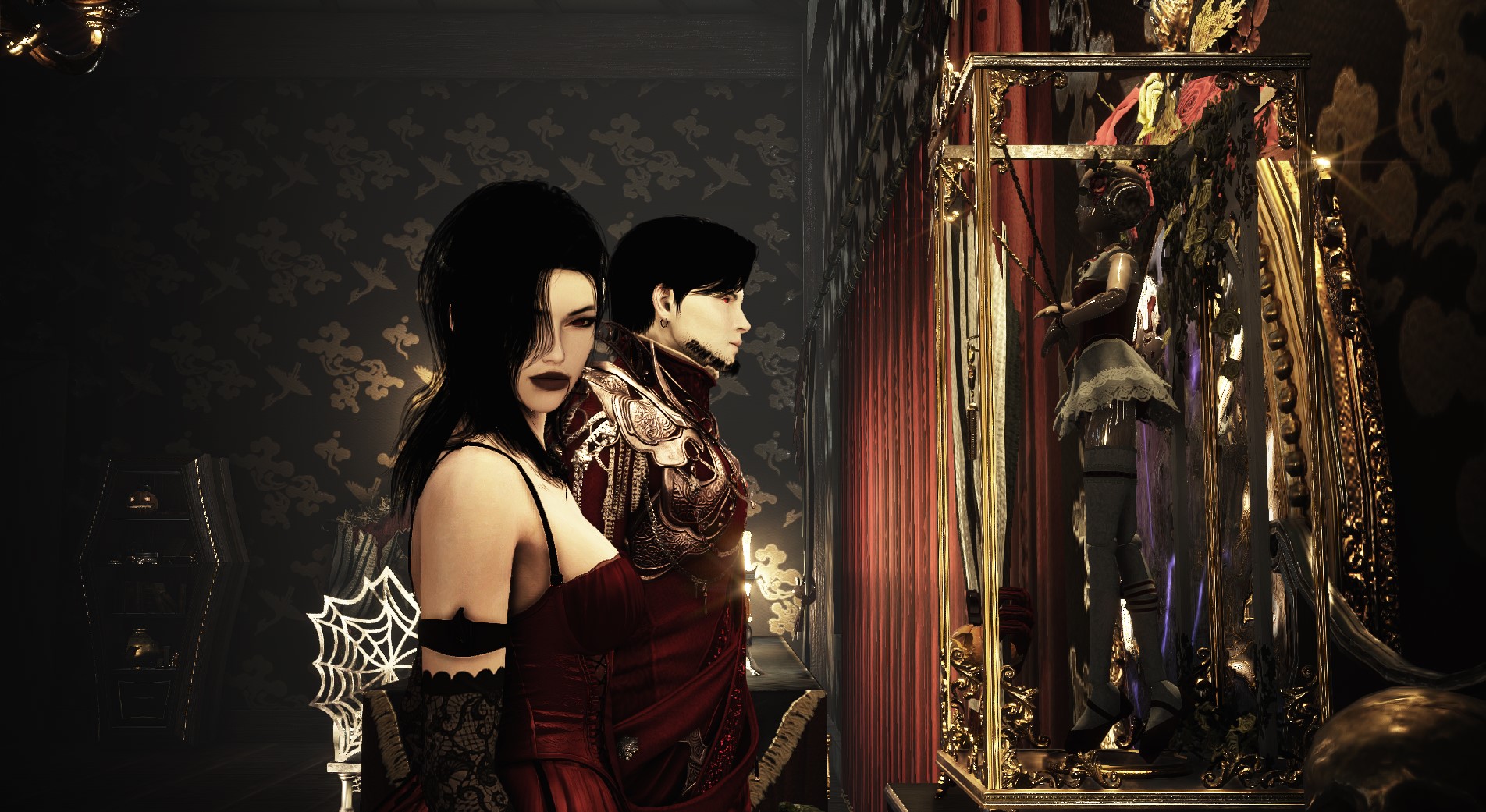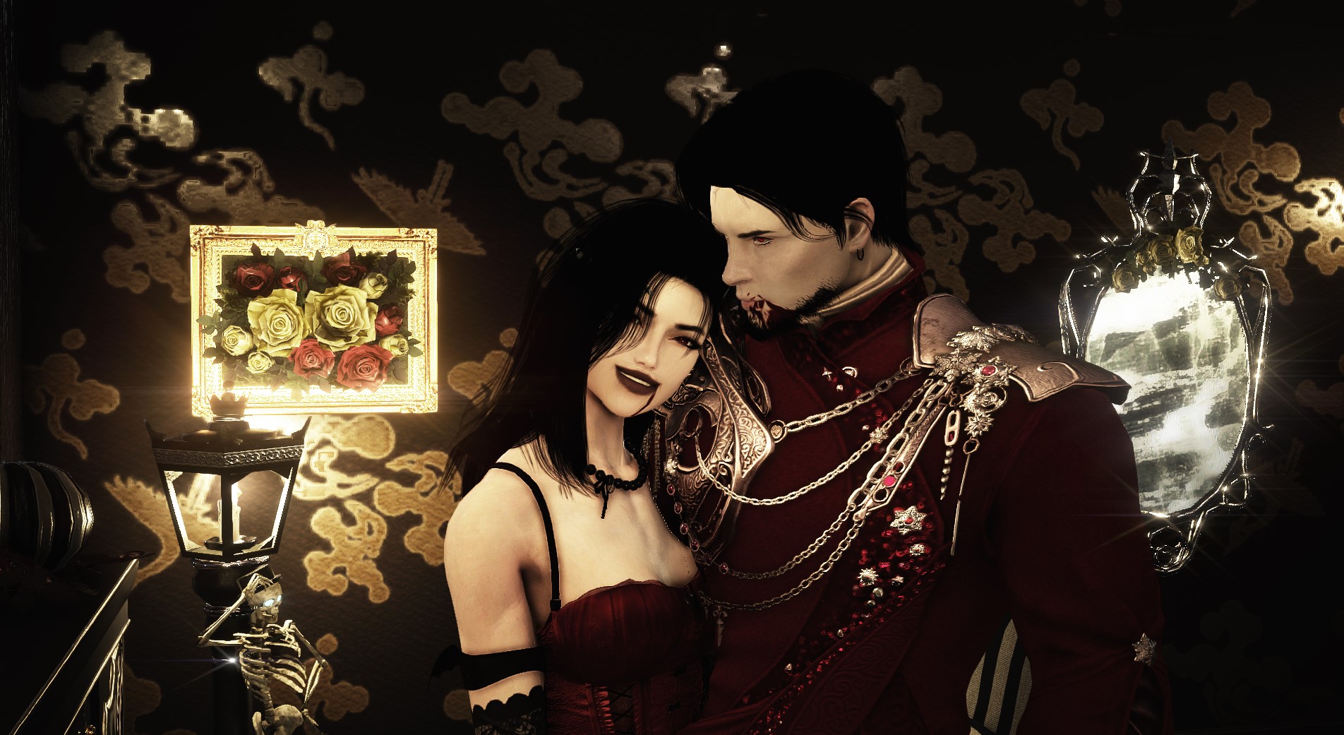 Милый, выше голову! Сегодня же праздник Хеллоуина! Смотри волшебное зеркало показывает нам интересные образы, я думаю можно остановится на тех что в красном.. никого не напоминает?😏🥰 Кажется как в Сумерках Эдвард и Бэлла, по- моему очень круто и символично!🎃🩸